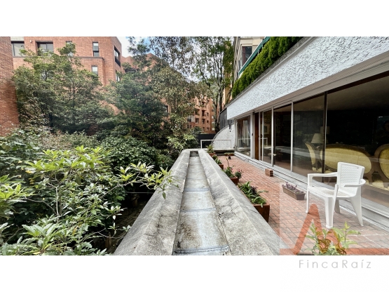 Estupendo apartamento diseñado en la decada de los ochentas por el arquitecto Bermúdez. Amplia sala comedor y biblioteca con chimenea funcional y acceso a terraza de 20 metros cuadrados, estudio independiente y baño social completo.  Cocina cerrada con lavanderia independiente y cuarto y baño de servicio.  Alcoba con solarium, vestier y baño privado.  Dos garajes independientes y depósito. Edificio con vigilancia 24/7.